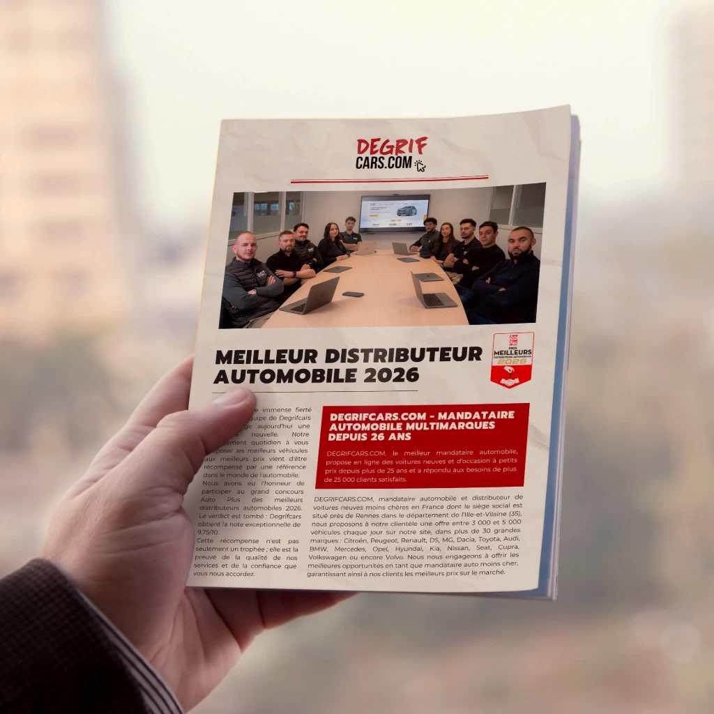 Jeudi 22 Janvier 2026 C'est avec une immense fierté que toute l’équipe de Degrifcars vous partage aujourd’hui une excellente nouvelle. Notre engagement quotidien à vous proposer les meilleurs véhicules aux meilleurs prix vient d'être récompensé par une référence dans le monde de l'automobile. Nous avons eu l'honneur de participer au grand concours Auto Plus des meilleurs distributeurs automobiles 2026. Le verdict est tombé : Degrifcars obtient la note exceptionnelle de 9,75/10. Cette récompense n'est pas seulement un trophée ; elle est la preuve de la qualité de nos services et de la confiance que vous nous accordez. Une reconnaissance de notre expertise de mandataire auto Être reconnu par un média aussi prestigieux qu'Auto Plus valide notre positionnement de mandataire auto de référence sur internet. Cette note de 9,75/10 reflète notre capacité à répondre aux exigences des automobilistes d'aujourd'hui, qui cherchent à concilier budget maîtrisé et sérénité d'achat. Ce classement met en lumière les piliers qui font le succès de Degrifcars depuis des années : Des prix imbattables : Nous négocions pour vous des remises pouvant aller jusqu’à -45% sur le tarif constructeur. Une offre large : Que vous cherchiez un véhicule neuf ou une voiture d’occasion récente, nous proposons toutes les marques pour satisfaire toutes les envies. Des solutions clés en main : De la recherche du véhicule à la livraison à domicile ou dans l'un de nos 12 points relais, nous simplifions chaque étape. Financement et Services : l'accompagnement récompensé Si nous avons atteint ce classement, c'est aussi parce que nous ne nous contentons pas de vendre des voitures. Nous accompagnons nos clients avec des solutions financières adaptées à chaque budget. Aujourd'hui, l'achat comptant n'est plus la seule option. Chez Degrifcars, nous sommes experts en : Leasing (LOA / LLD) : La Location avec Option d'Achat ou la Location Longue Durée pour rouler toujours récent en maîtrisant son budget mensuel. Crédit classique : Des solutions de financement flexibles. La Reprise : Nous reprenons votre ancien véhicule pour faciliter votre nouveau projet. C'est cet accompagnement global, incluant nos garanties solides, qui a su séduire le jury et, surtout, nos clients. La satisfaction client au cœur de notre ADN Ce trophée et cette excellent note sont avant tout le fruit du travail acharné de nos équipes. Commerciaux, administratifs, logistique : chaque collaborateur de Degrifcars s'investit pour vous offrir une expérience irréprochable. Cette récompense Auto Plus vient s'ajouter aux excellents retours que nous recevons quotidiennement de votre part sur les différentes plateformes d'avis : Google : 4,6/5 Trustpilot : 4,8/5 Avis Garantis : 9,4/10 Ces notes sont notre plus grande fierté. Elles témoignent de notre transparence et de notre volonté de vous satisfaire à chaque kilomètre. Prêt à trouver votre prochaine voiture au meilleur prix ? Vous souhaitez profiter des services d'un distributeur reconnu et primé ? Que vous soyez en Bretagne ou partout ailleurs en France, Degrifcars est là pour vous. N'attendez plus pour découvrir nos stocks de véhicules neufs et d'occasion et profitez de nos remises exceptionnelles. Faites confiance à une équipe notée 9,75/10 pour votre prochain projet automobile ! Vous avez un projet d'achat de voiture ? Contactez-nous Degrifcars – L’occasion de rouler au meilleur prix ! Retour aux actualités